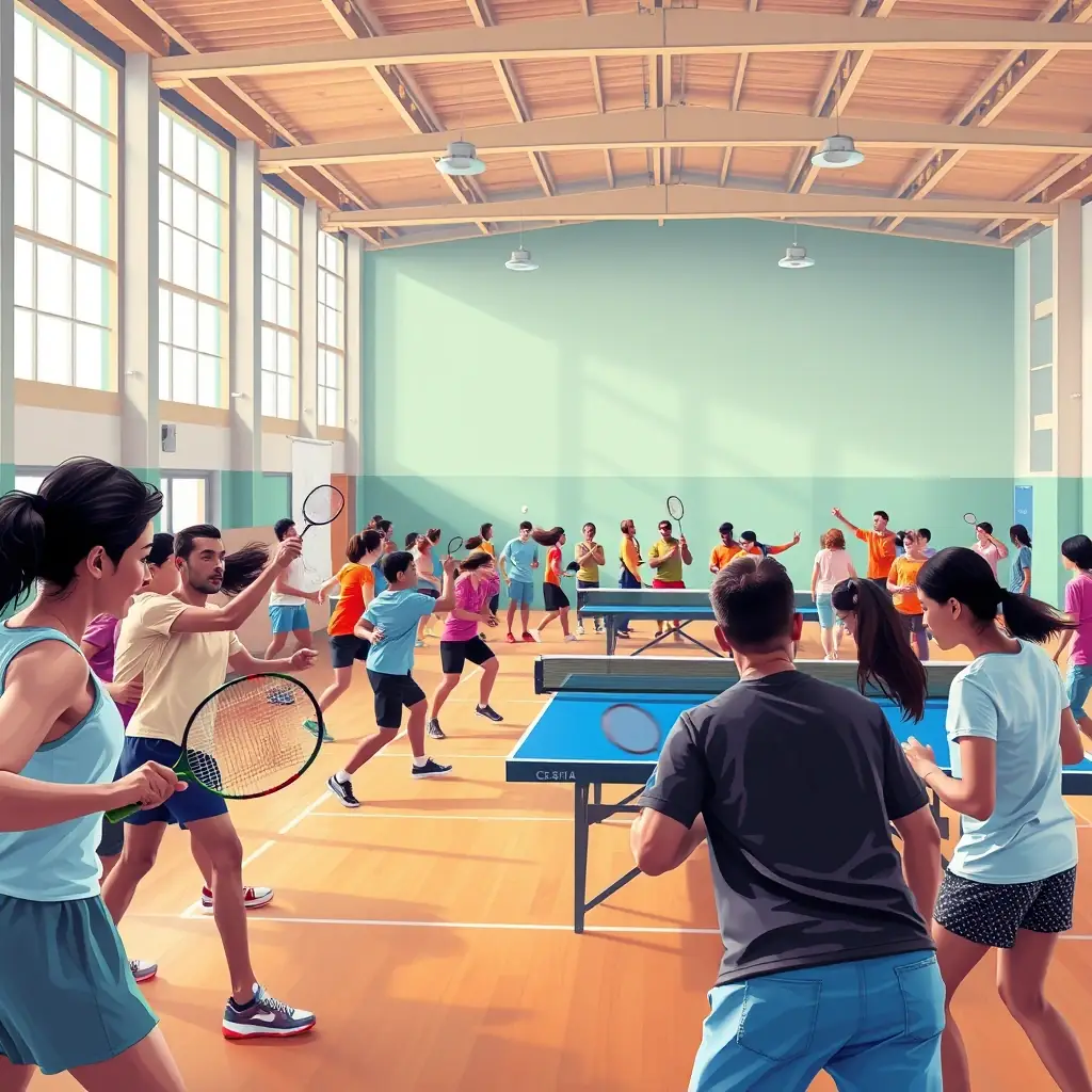 A dynamic badminton training session with diverse participants, showcasing agility and teamwork, set against a vibrant indoor court backdrop, emphasizing the inclusive nature of 3 RAQUETTES' programs.